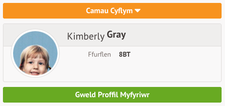 Mae’r Proffil Myfyriwr ar y Porth Rhieni yn rhoi trosolwg i chi o fanylion personol y myfyriwr. I fynd at y proffil myfyriwr, dewiswch y botwm gwyrdd Gweld y Proffil Myfyriwr.