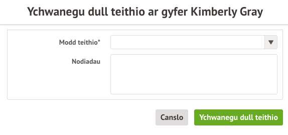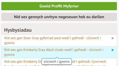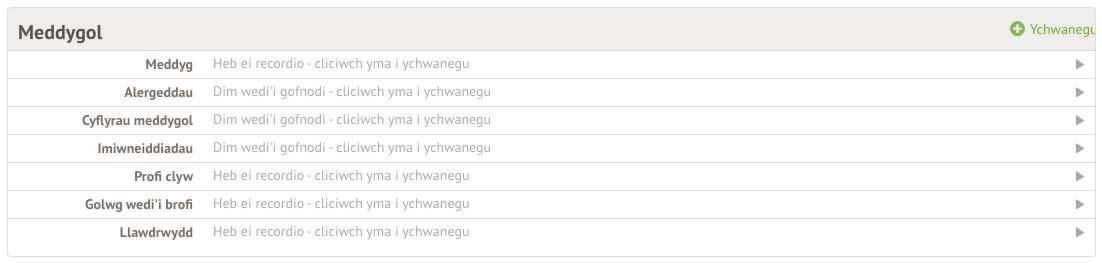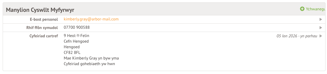 Gallwch chi hefyd ychwanegu neu ddiwygio gwybodaeth yn unrhyw le y gwelwch chi eicon saeth ar yr ochr dde. Cliciwch ar y wybodaeth i’w diwygio.