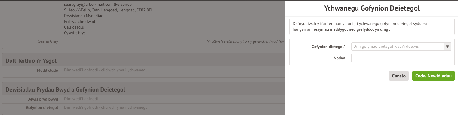 Mae’r adran Dewisiadau Prydau Bwyd a Gofynion Deietegol yn dangos unrhyw ofynion deietegol sydd gan y myfyriwr ac yn arddangos y dewisiadau prydau bwyd presennol.