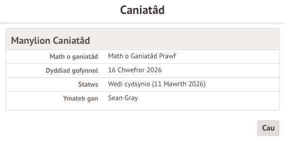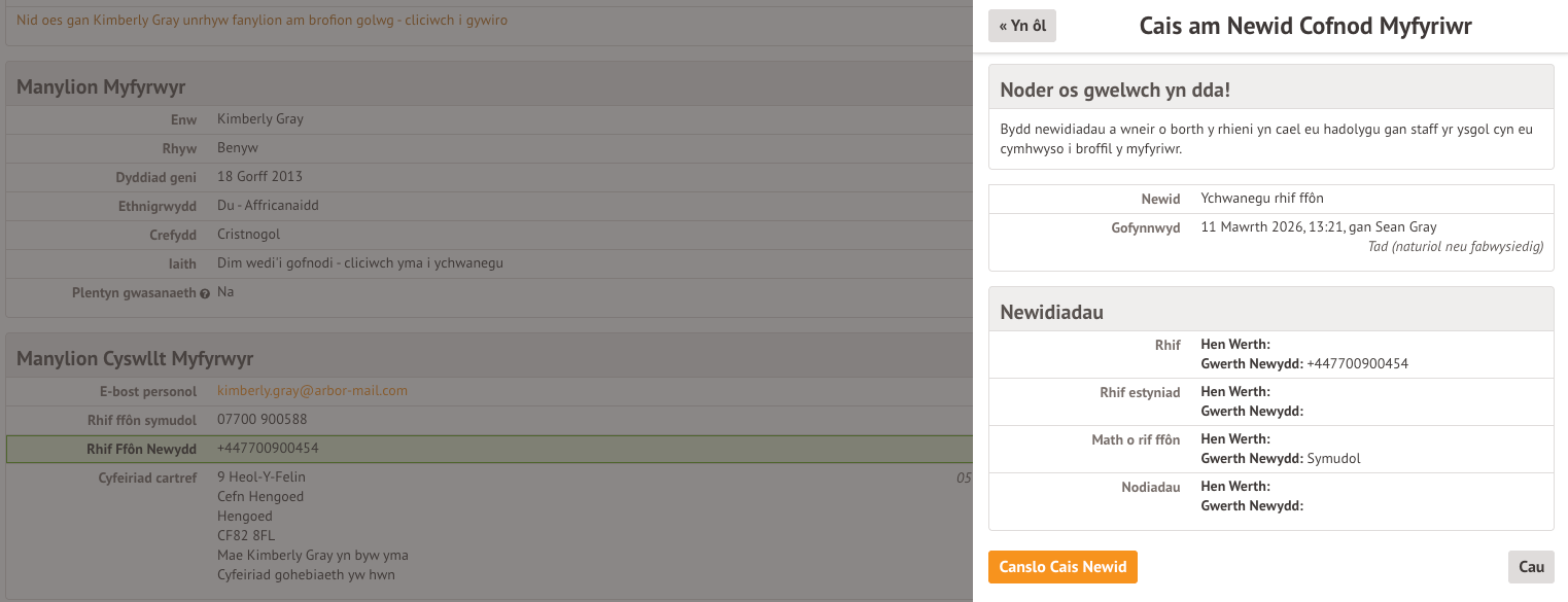 Os byddwch yn clicio ar eitem sy’n aros am gadarnhad gan eich ysgol i’r newidiadau ddod i rym, gallwch weld y wybodaeth, neu ganslo’r cais i newid.