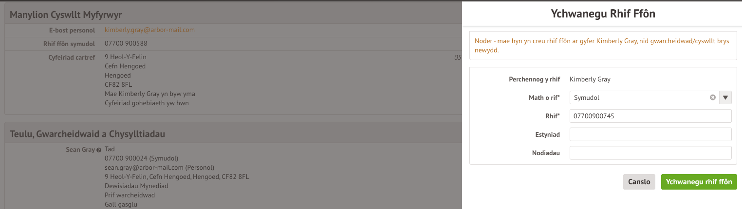 Fy manylion cyswllt i, a manylion cyswllt gwarcheidwaid eraill