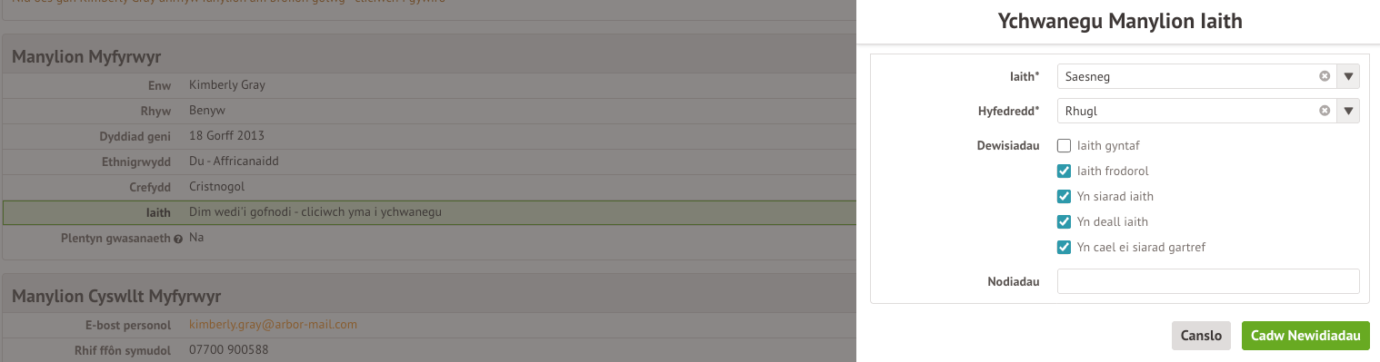 I ddiweddaru’r wybodaeth hon, cliciwch ar hysbysiad. Bydd dewislen llithro drosodd yn ymddangos lle gallwch ychwanegu’r wybodaeth angenrheidiol.
