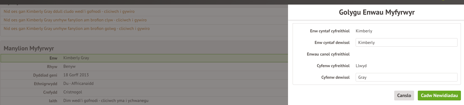 Cliciwch ar y manylion am y myfyriwr yr hoffech eu diwygio. Wedyn, bydd dewislen llithro drosodd yn ymddangos i chi ddiweddaru’r wybodaeth. Ar ôl diweddaru’r wybodaeth, dewiswch Cadw’r Newidiadau.