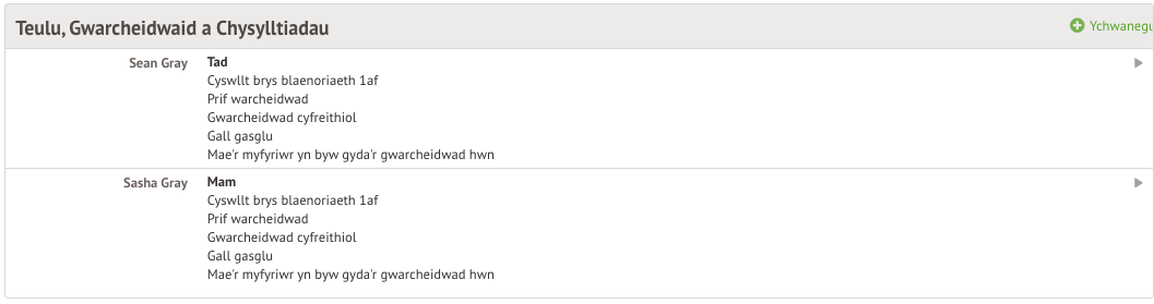 Mae’r adran Teulu, Gwarcheidwaid a Chysylltiadau yn arddangos pob un o’r gwarcheidwaid sy’n gysylltiedig â phroffil y myfyriwr. Gallwch chi ond gweld a diweddaru eich manylion eich hun.