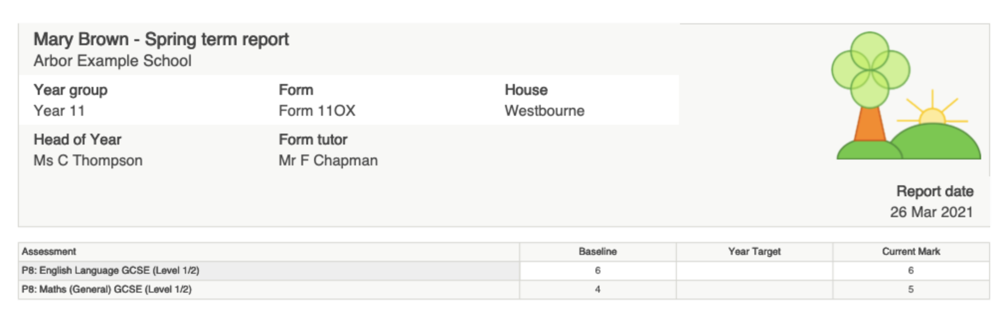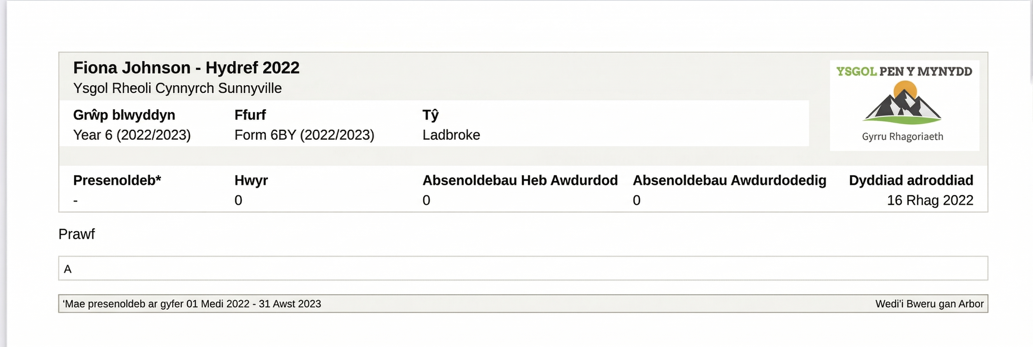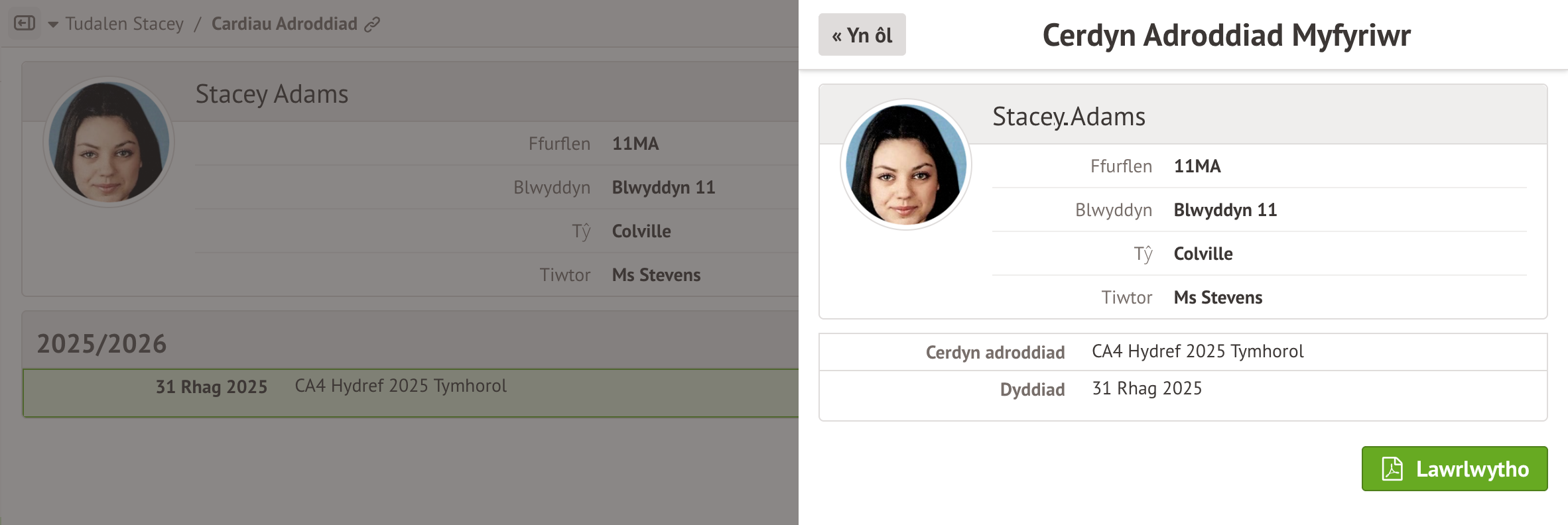 Gallwch gael mynediad at gerdyn adroddiad PDF (os yw eich ysgol wedi dewis rhannu hyn gyda chi).