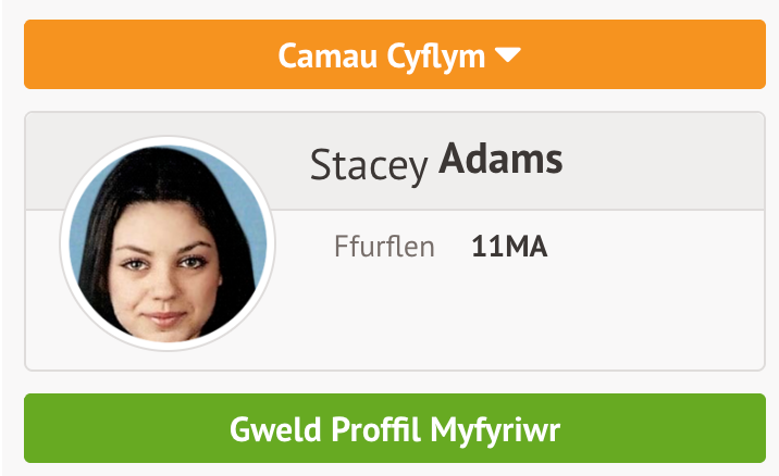 Cliciwch ar Gweld y Proffil Myfyriwr, wedyn ewch i Cardiau Adroddiadau o’r ddewislen ar yr ochr chwith.