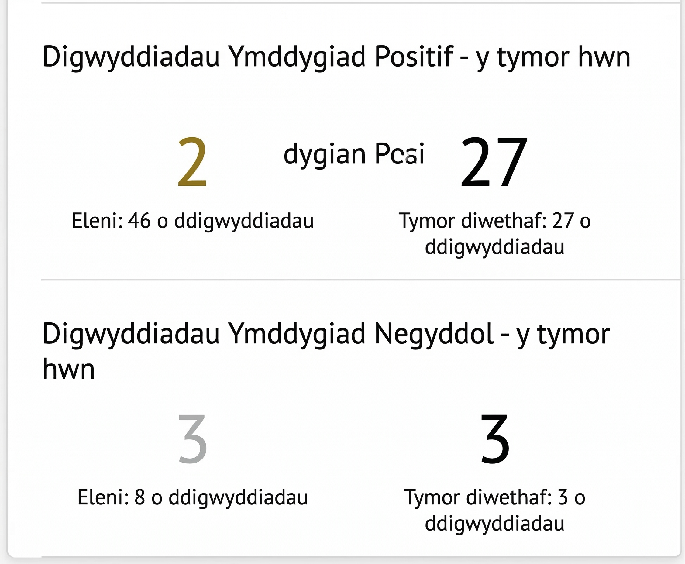 Yn yr un modd â graddfeydd pwyntiau, efallai y byddwch chi’n gweld digwyddiadau cadarnhaol, digwyddiadau negyddol, y ddau neu nid y naill na’r llall, yn dibynnu ar beth mae eich ysgol wedi penderfynu ei arddangos.