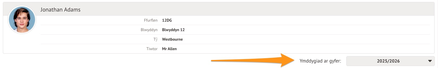 Caiff sgorau ymddygiad y myfyriwr o’r flwyddyn academaidd bresennol eu dangos fel mater o drefn. I newid y flwyddyn academaidd, cliciwch ar y gwymplen.