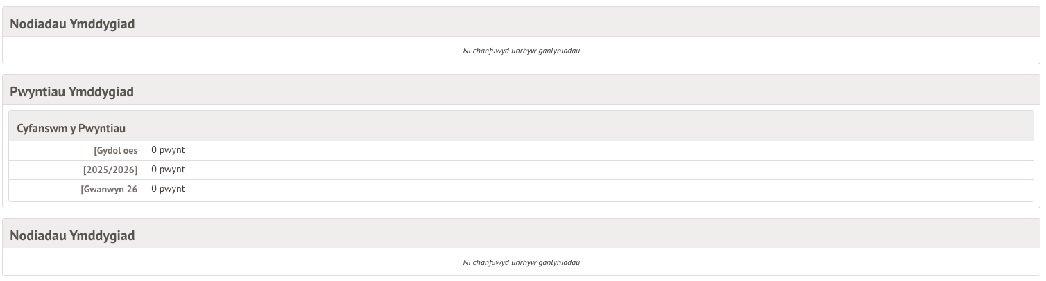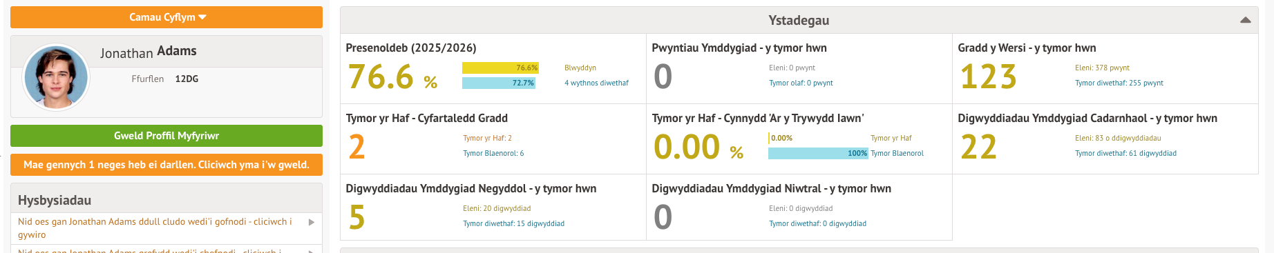 Ar eich Hafan, gallwch chi weld y pwyntiau sydd wedi cael eu dyfarnu i’ch plentyn, a’r digwyddiadau cadarnhaol a negyddol (yn dibynnu ar beth mae eich ysgol wedi dewis ei arddangos) eleni hyd yma, ac ar gyfer y tymor diwethaf.