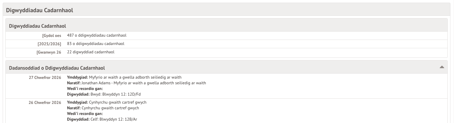 Gallwch chi weld digwyddiadau cadarnhaol a negyddol sydd wedi eu cofnodi, yn cynnwys dadansoddiad (yn dibynnu ar beth mae eich ysgol wedi’i rannu gyda chi).