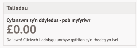 Bydd hyn yn dangos fel £0 os yw’r balansau i gyd yn 0 neu i gyd yn gadarnhaol.