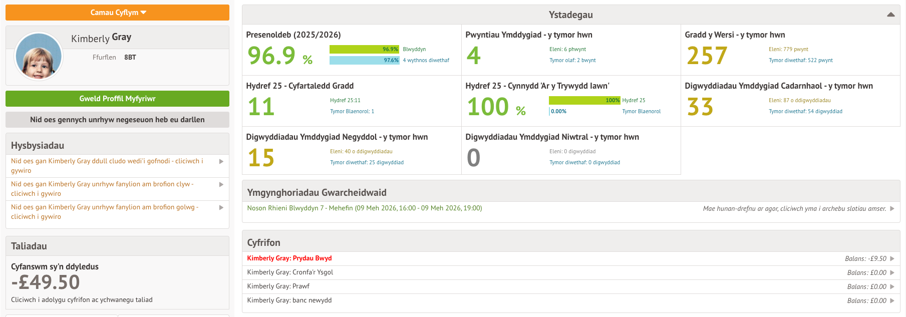 • Dewis y plentyn o’r gwymplen yn y top ar yr ochr chwith, a dewis y cyfrif o’ch hafan.
