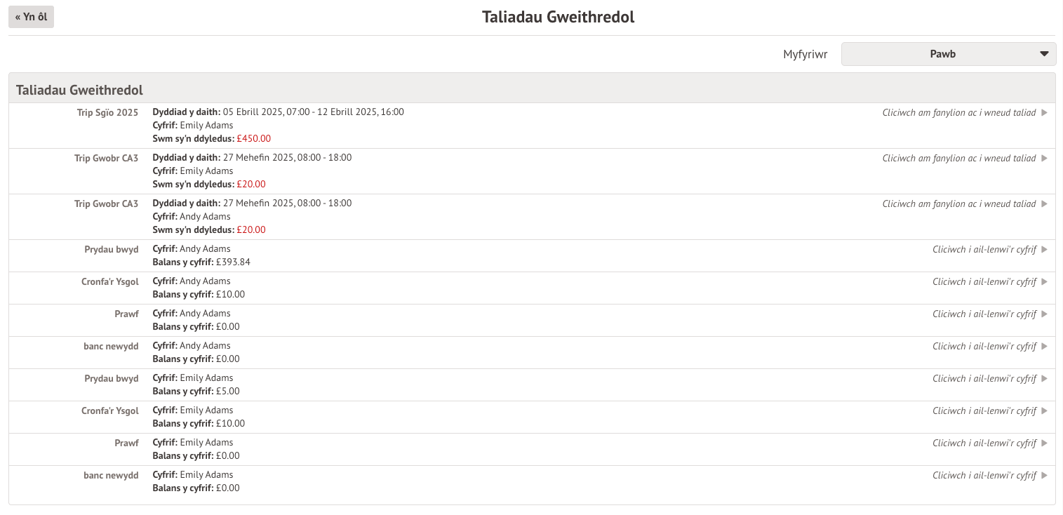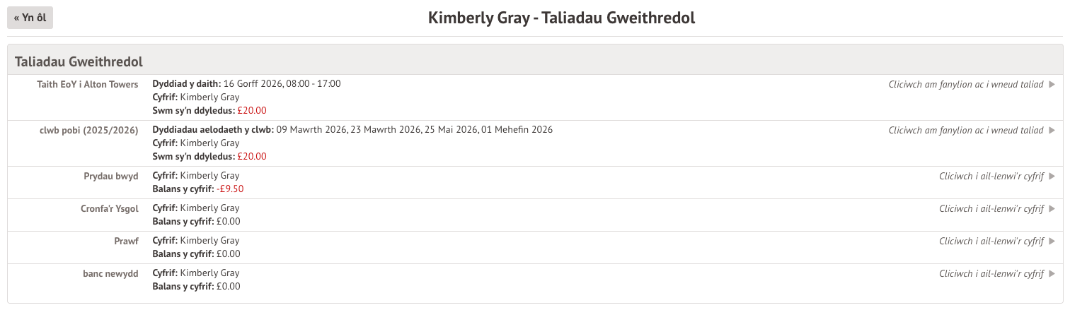 Gallwch chi reoli cyfrifon ar gyfer unrhyw ardal o Arbor y mae eich ysgol wedi ei chreu i dderbyn taliadau ar eu cyfer. Yma, gallwch chi wneud taliadau ac ychwanegu arian at gyfrifon, hefyd. I gael mwy o wybodaeth am wneud taliadau, gweler ein herthyglau ynghylch cofrestru ar gyfer clwb ac ynghylch cofrestru ar gyfer trip.
