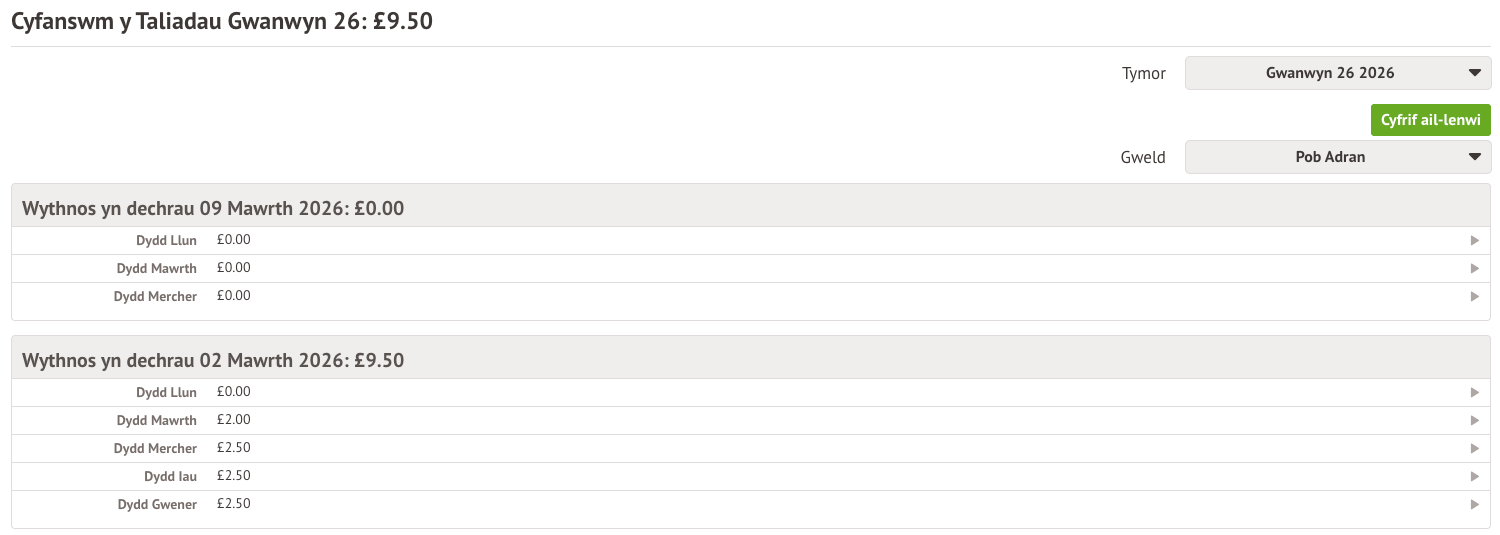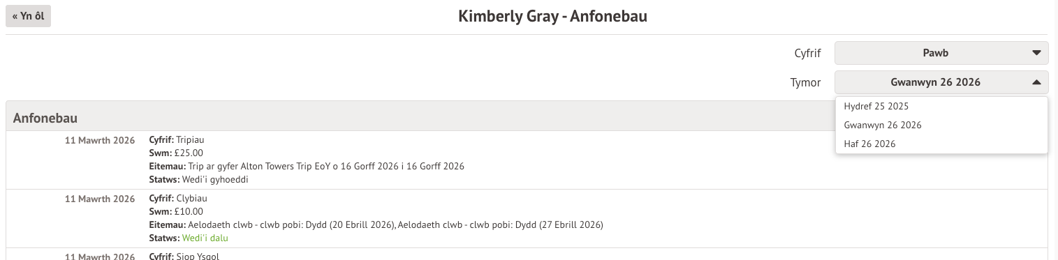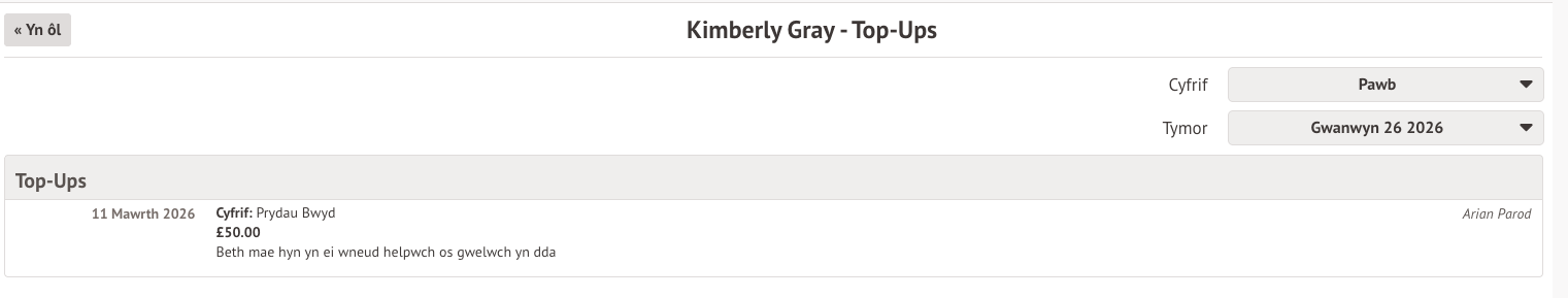 Bydd y dudalen Ychwanegu arian ar y Porth Rhieni yn llwytho’r arian a ychwanegwyd ar gyfer y myfyriwr penodol hwnnw yn ystod y tymor presennol.