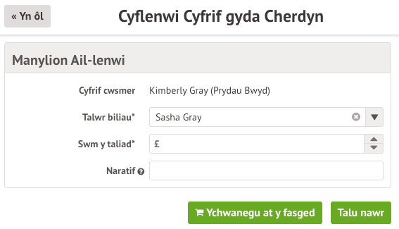Bydd dewislen llithro drosodd yn llwytho, lle gallwch chi ddewis y talwr biliau a swm y taliad. Sylwch mai isafswm y taliad yw £2.