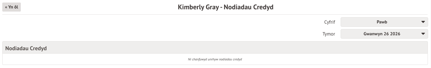Bydd y dudalen Nodau Credyd ar y Porth Rhieni yn llwytho tabl gyda’r holl nodau credyd ar gyfer y tymor presennol.