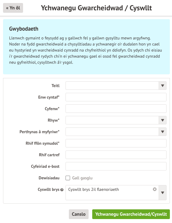 Sylwer: I farcio rhywun yn Brif Warcheidwad, cysylltwch â’r ysgol yn uniongyrchol wedi i chi ychwanegu’r wybodaeth.