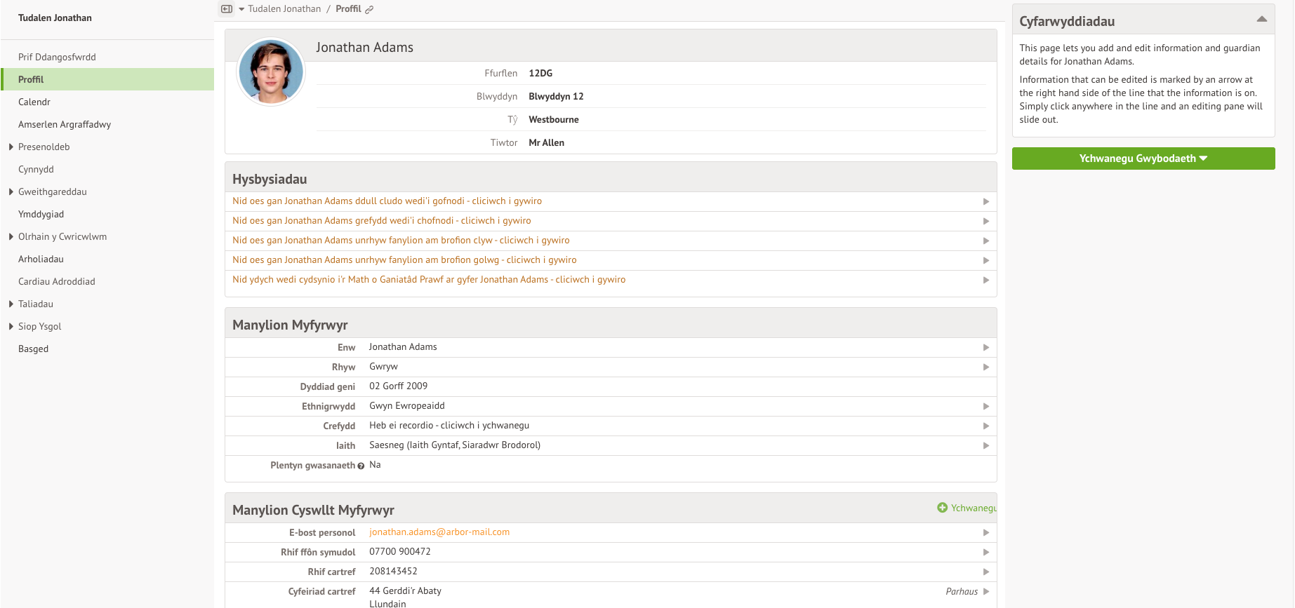 Gan mai chi yw’r prif warcheidwad, gallwch chi fewngofnodi yn y Porth Rhieni neu’r Ap Rhieni a diweddaru manylion eich plentyn. Er na allwch chi olygu manylion gwarcheidwaid eraill (bydd angen i chi gysylltu â’ch ysgol yn uniongyrchol iddynt wneud hyn ar eich rhan), gallwch ychwanegu gwarcheidwaid newydd sy’n gysylltiedig â’ch plentyn.