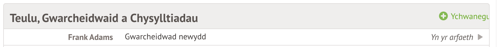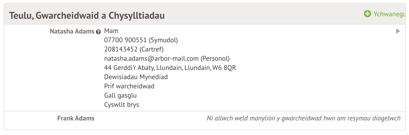 Gallwch chi hefyd glicio ar +Ychwanegu yn yr adran Teulu, Gwarcheidwaid a Chysylltiadau.