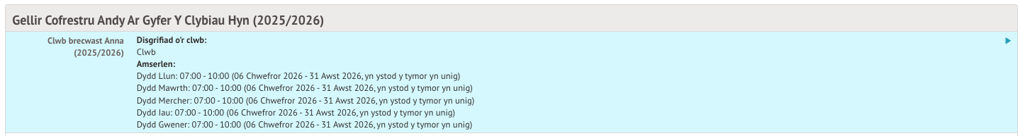 Wedyn, gallwch weld rhestr o unrhyw glybiau y mae eich plentyn yn eu mynychu, ac unrhyw glybiau sy’n agored i’ch plentyn.