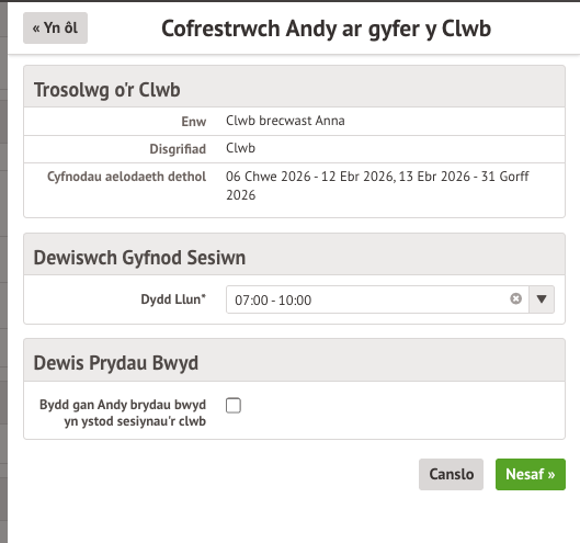 Os bydd eich ysgol yn cynnig amseroedd gwahanol y gallwch chi gofrestru ar eu cyfer, gallwch ond nodi un ar gyfer pob diwrnod. I newid yr amser ar gyfer gwahanol wythnosau, cofrestrwch ar gyfer pob sesiwn un ar y tro.
