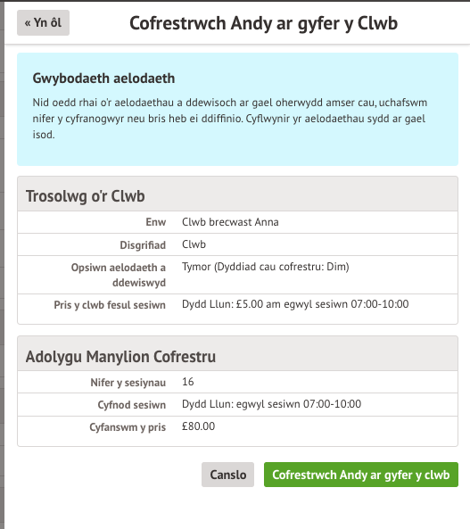 - Os yw eich ysgol yn codi tâl am y clwb ond heb nodi’r pris ar gyfer y sesiwn, ni fyddwch yn gallu trefnu lle i’ch plentyn yn y sesiwn – cysylltwch â’ch ysgol a gofyn iddi ychwanegu pris ar gyfer y sesiwn.