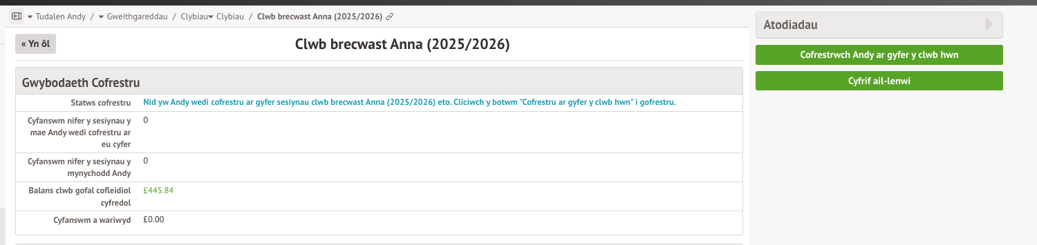 Wedyn, eir â chi’n ôl at y dudalen sy’n rhoi gwybodaeth am y clwb, lle bydd yr aelodaeth(au) newydd yn awr yn cael ei/eu harddangos.