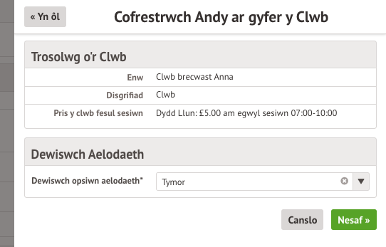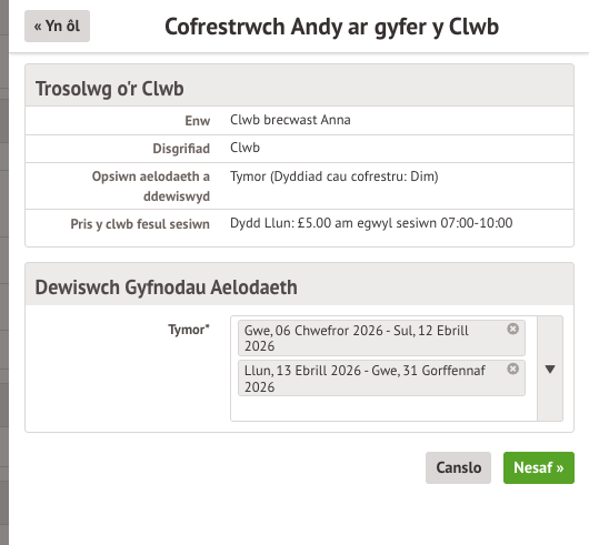 Wedyn, dewiswch pa amseroedd i gofrestru ar gyfer y clwb.