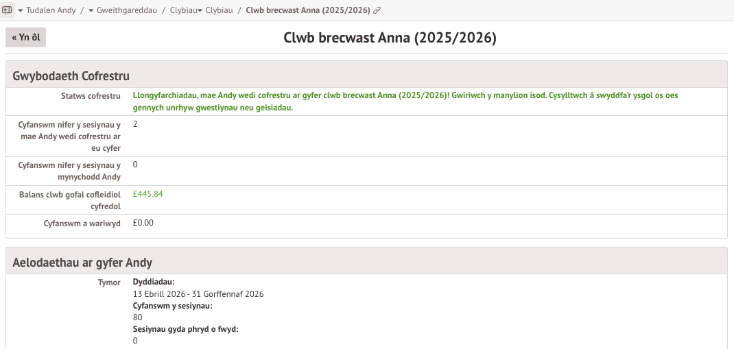 Bydd y dudalen sy’n rhoi gwybodaeth am glybiau yn arddangos gwybodaeth am aelodaeth ac amserlen. Bydd unrhyw aelodaeth bresennol i’r clwb ar gyfer y disgybl yn cael ei harddangos. I gofrestru eich plentyn ar gyfer y clwb, cliciwch ar Cofrestru Ar Gyfer Y Clwb Hwn yng nghornel uchaf y dudalen ar yr ochr dde.