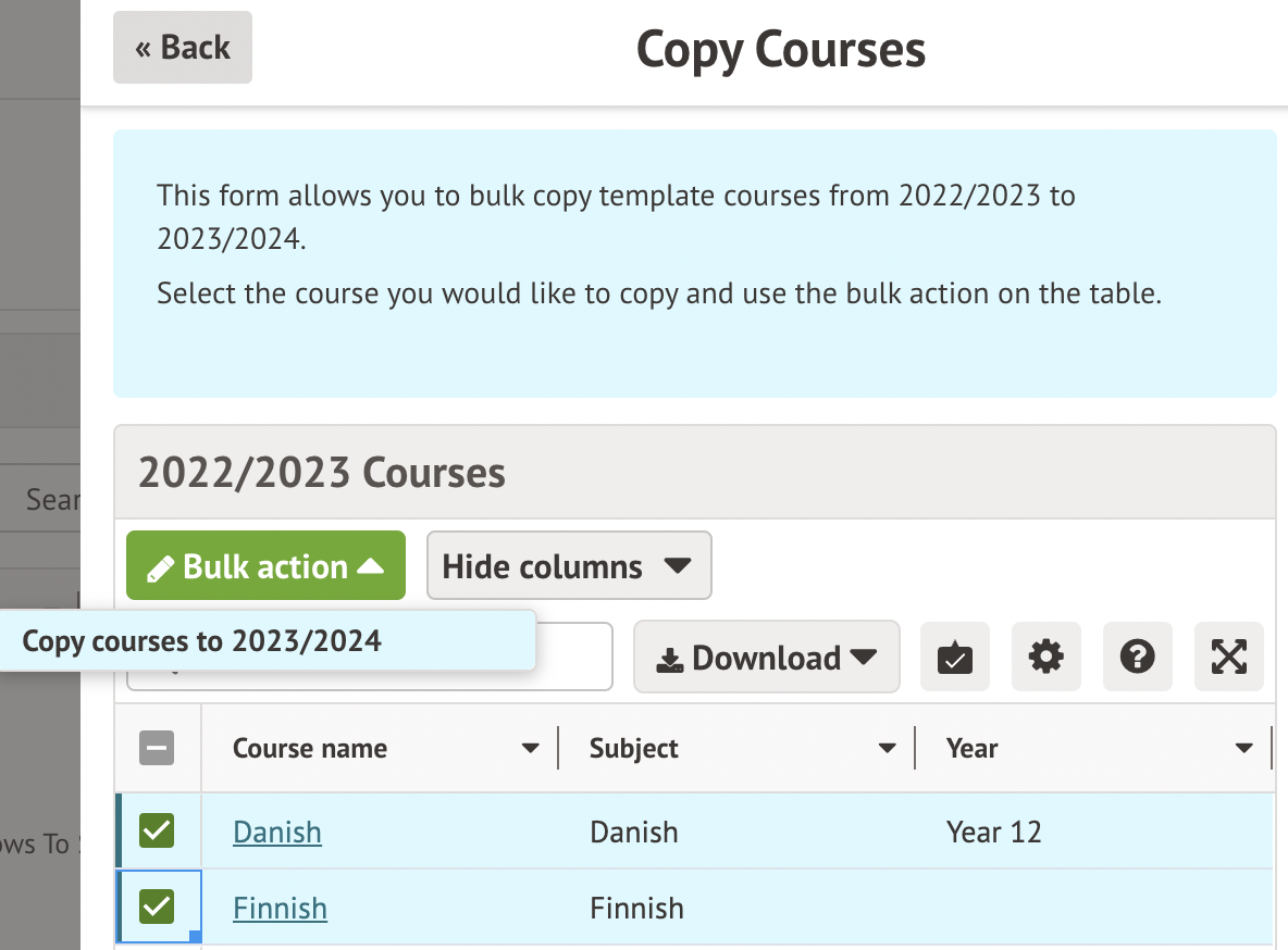These courses aren't automatically copied to the next academic year, so you'll need to set them up or copy them over to be able to take attendance and generate timetables for the next year. This article will show you how to do this.