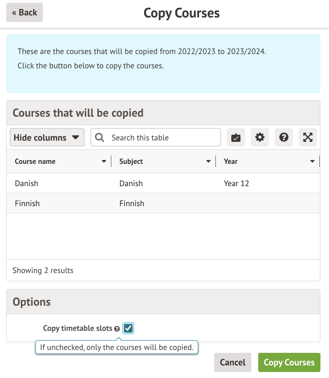 Choose whether to copy the courses only, or include the timetable slots, then click Copy Courses.