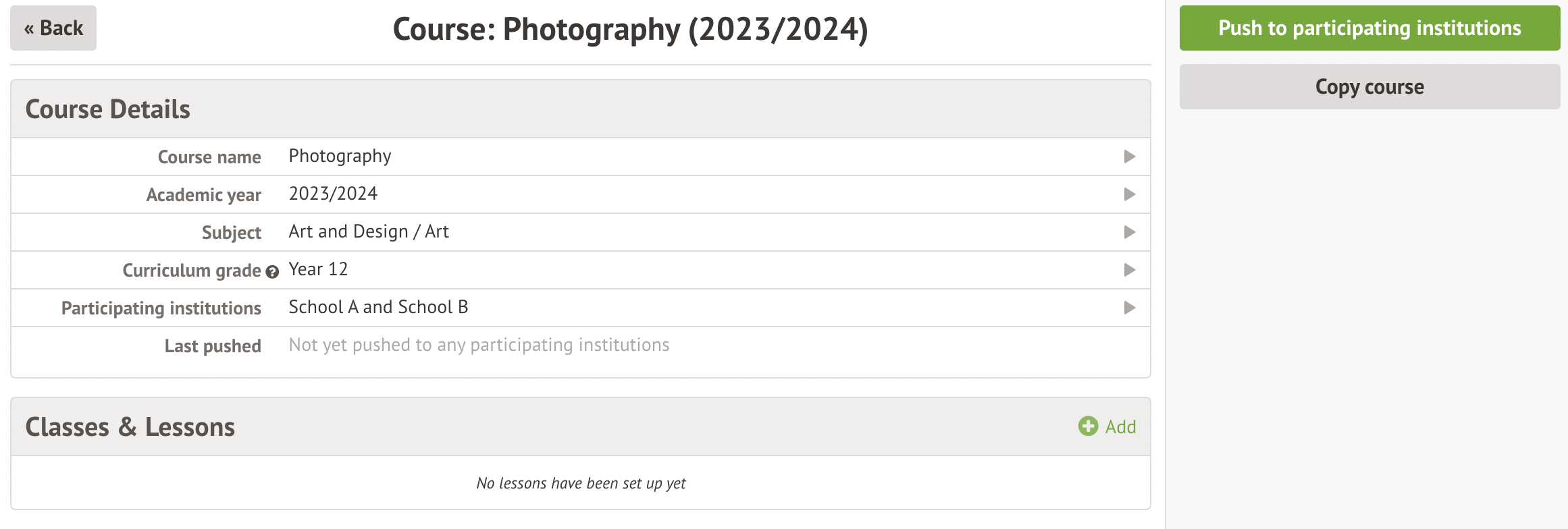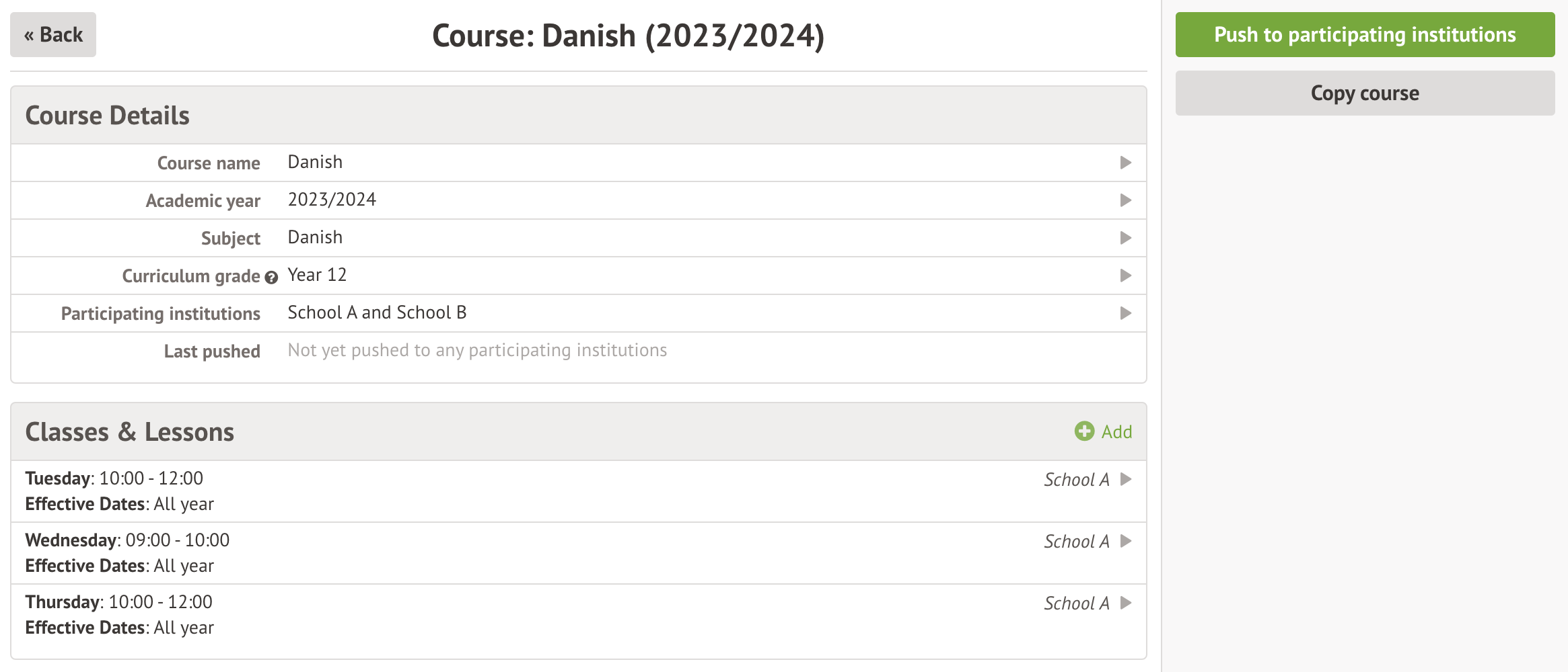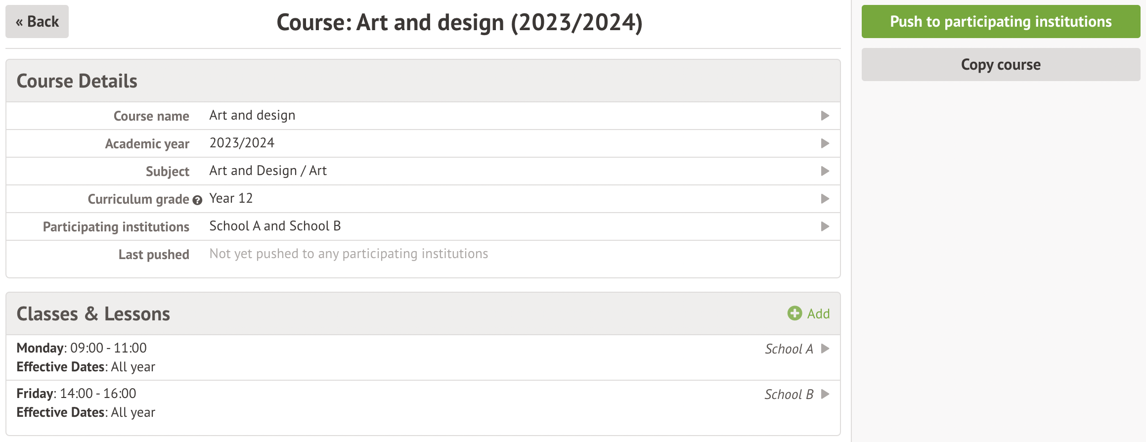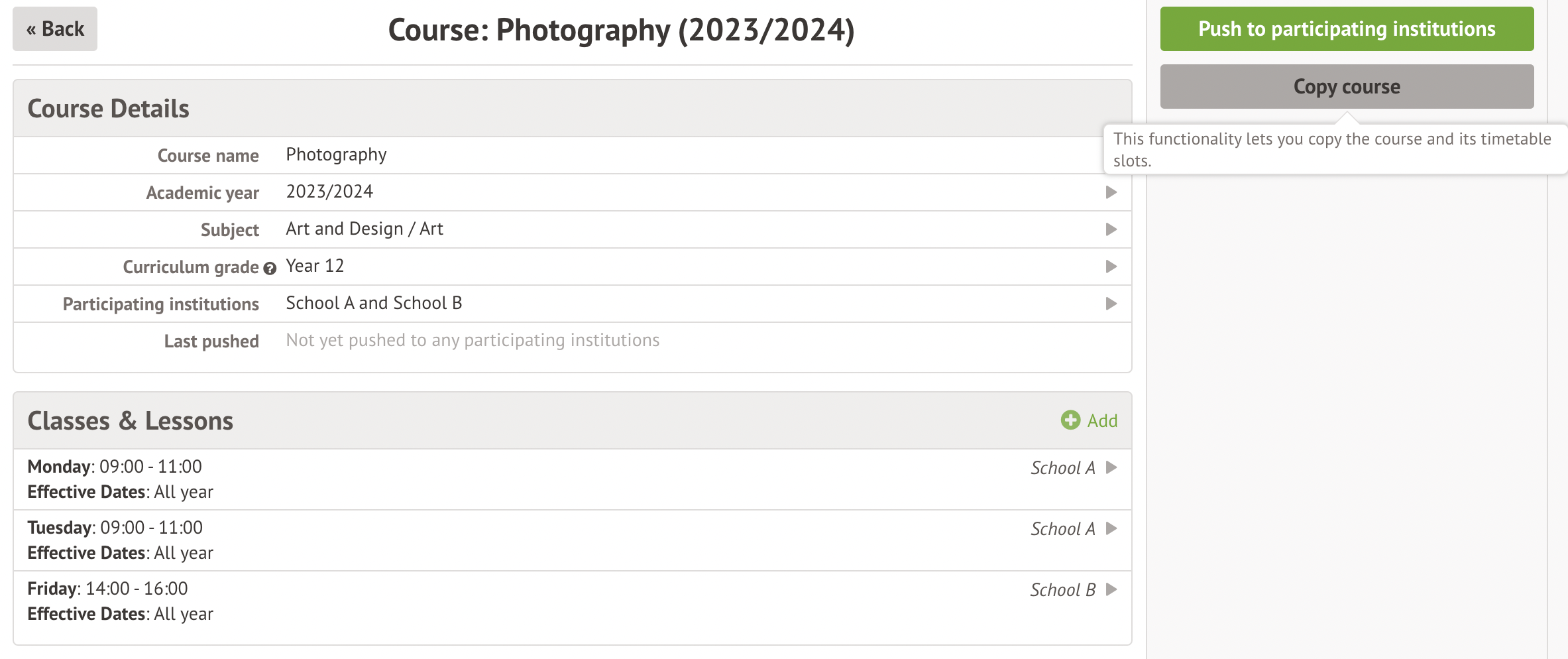 You'll then be taken to the page for the new course. You can add more timetable slots if needed, then push to the schools.