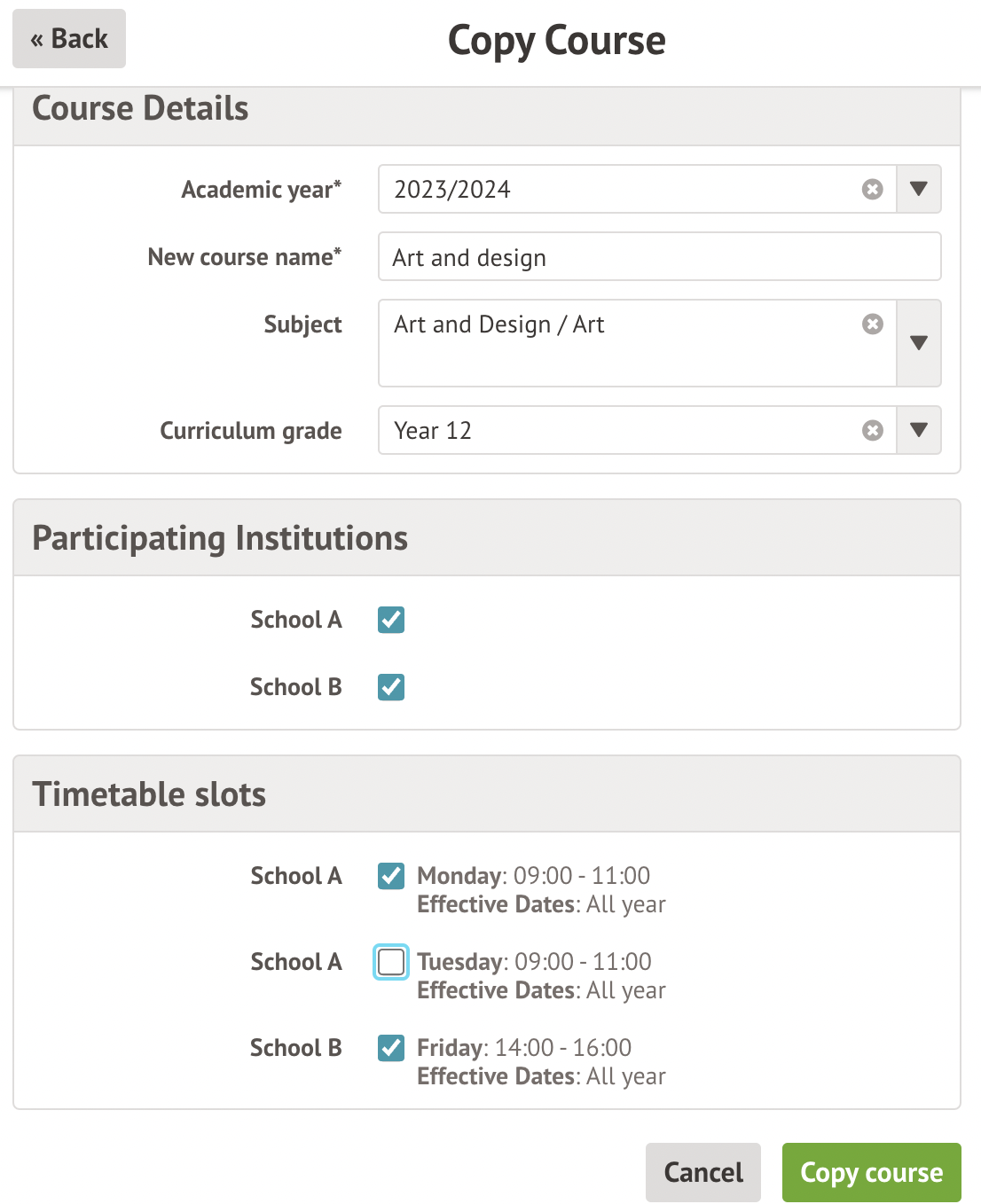 You can also choose which institutions will participate in the new course and which timetable slots you want to copy.
