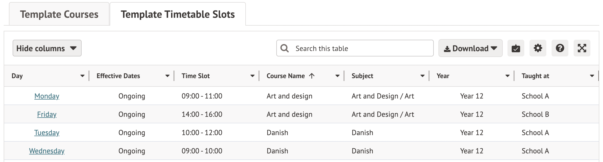 You'll then be taken back to the overview where you can see your created courses. In this example I've got two courses where I've copied the slots, and one where I have not.