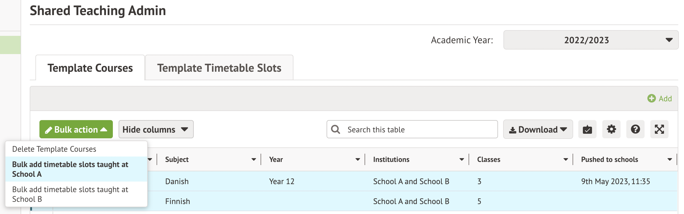 - You should create your Shared Teaching courses (with timetable slots) on the Shared Teaching Admin site following the instructions below. Make sure you push the courses and timetable slots to the participating schools.