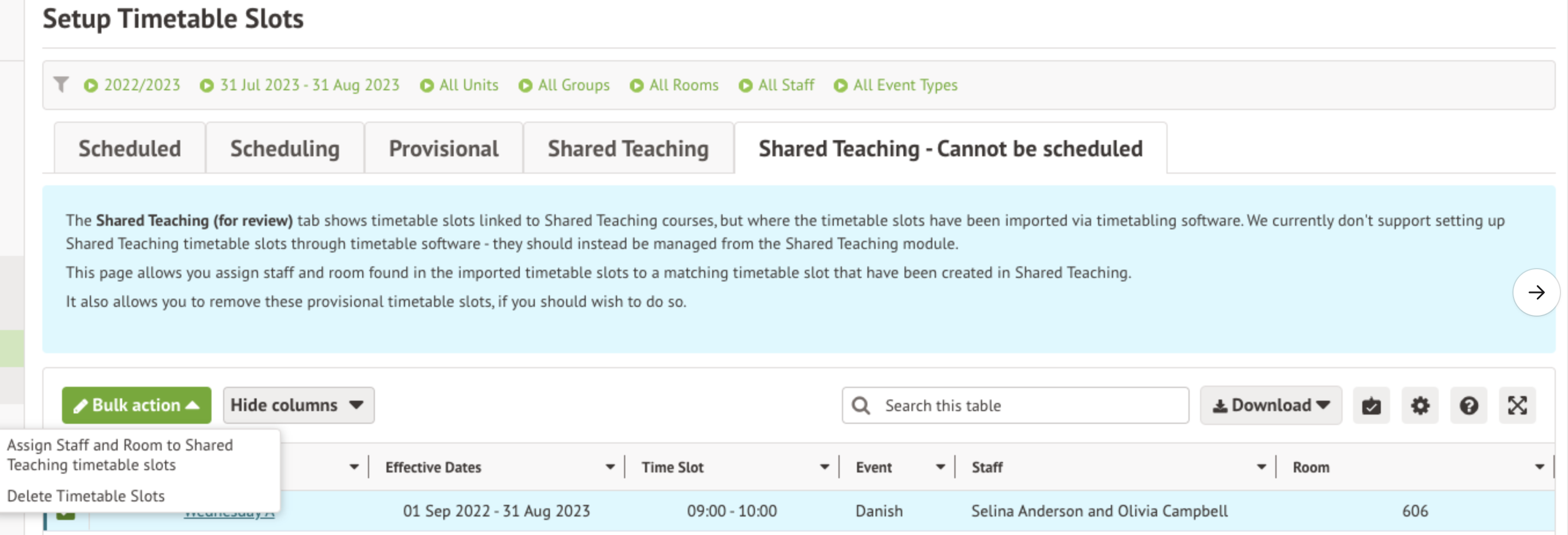 Schools can then go to School > Timetable > Timetable Administration > Timetable Slots page and click on the Shared Teaching - Cannot be scheduled tab. Tick the boxes next to the courses to match staff and locations for and click the Bulk action button to select Assign Staff and Room to Shared Teaching timetable slots.