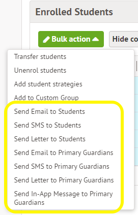 This will then take you to be able to send an email or SMS, or generate a letter to the students selected, or their guardians.