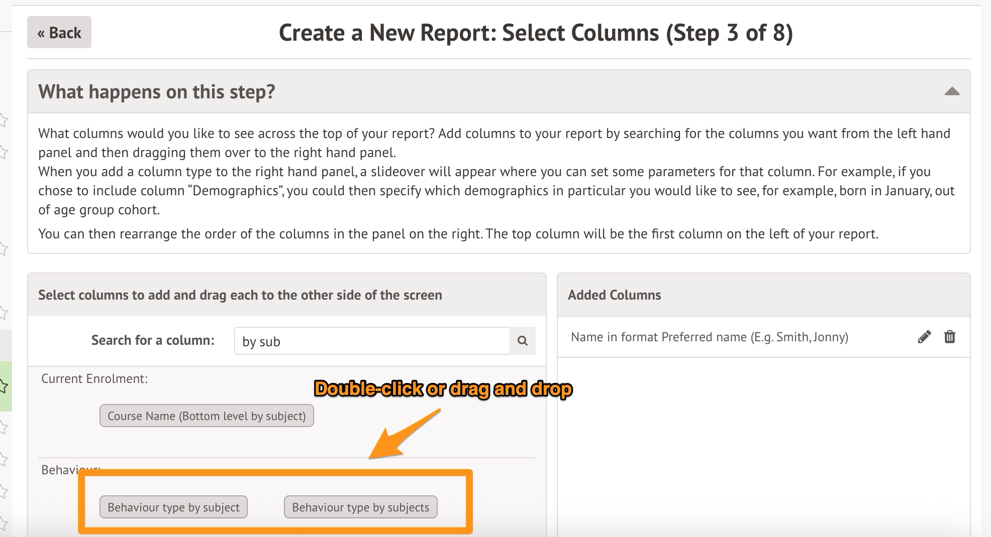 In Step 3 of creating your custom report, you'll need to add a report column for either Behaviour Type by subject (use this if you only want one subject) or Behaviour Type by subjects (use this if you want to combine multiple subjects) to your report by clicking and dragging to the added columns section on the right.