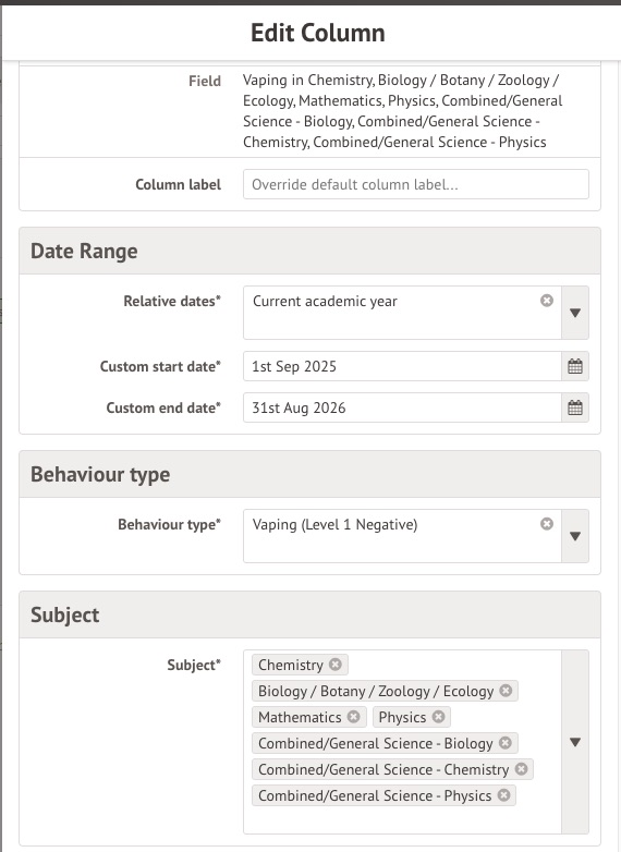 On the slide-over, you can set the dates, the behaviour type and the subject. The report column will be renamed to the behaviour type you choose, rather than displaying as Behaviour Type by subject(s).