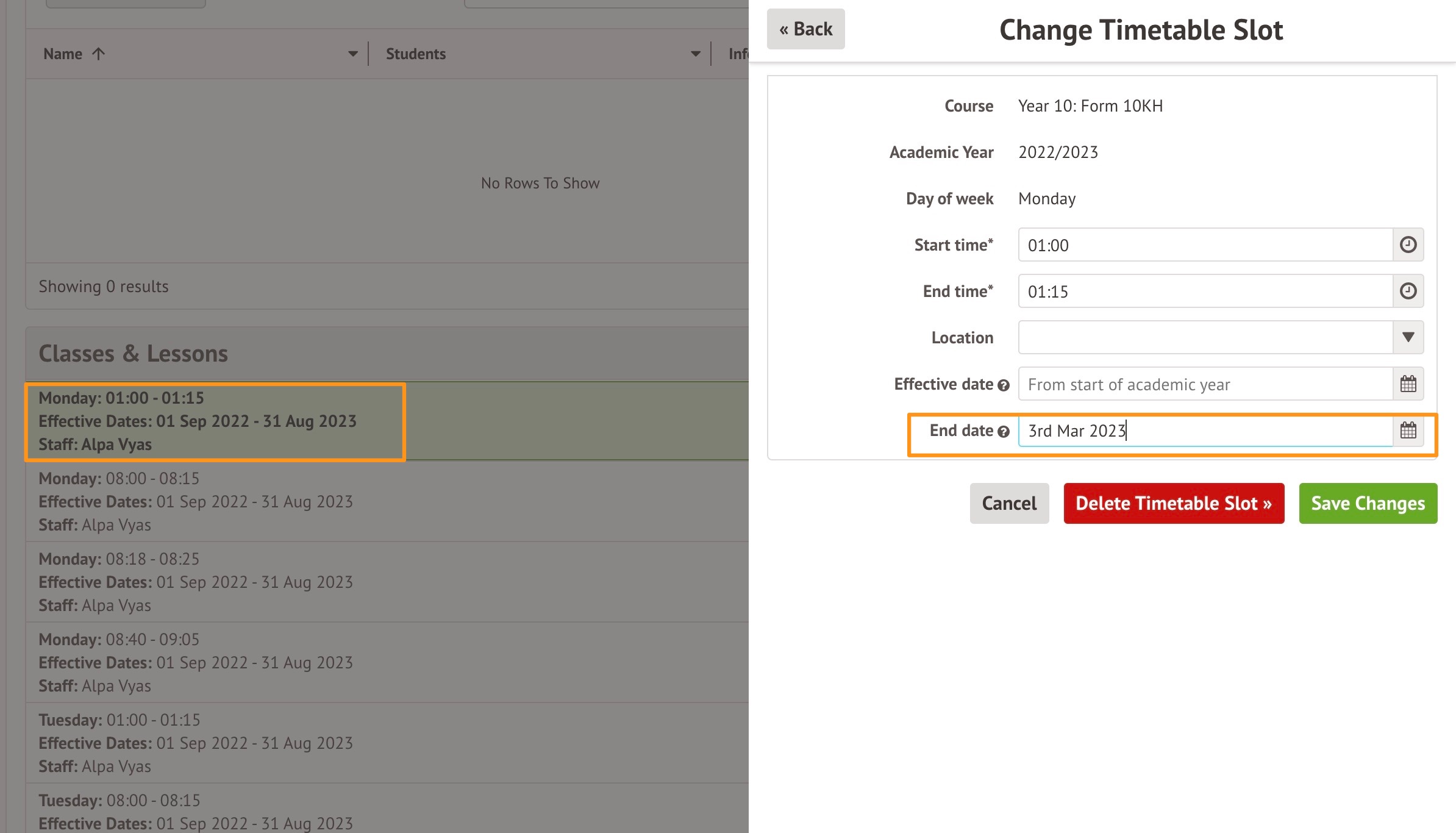 On the following page, click on each timetable slot found in the Classes and Lessons section, click Edit, add an end date and click Save Changes.