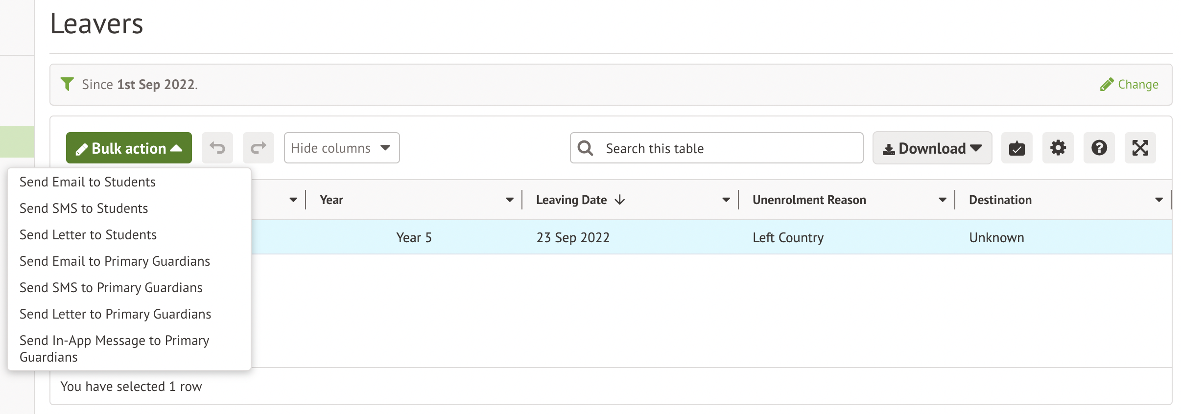 To send a communication to students who were unenrolled this academic year or their guardians, tick the students and click the Bulk action button. Select the communication type.