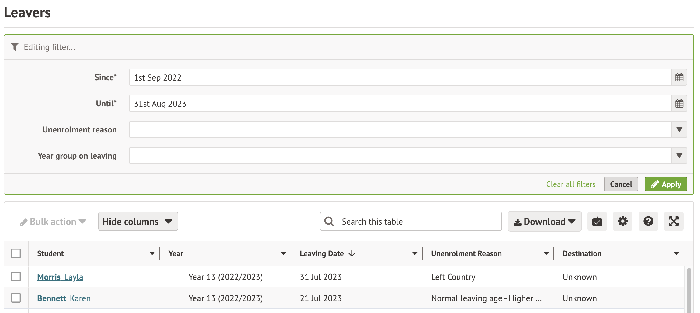 Top Tip: Once the filters are applied, you can see a count of how many students joined during this time at the bottom of the table.