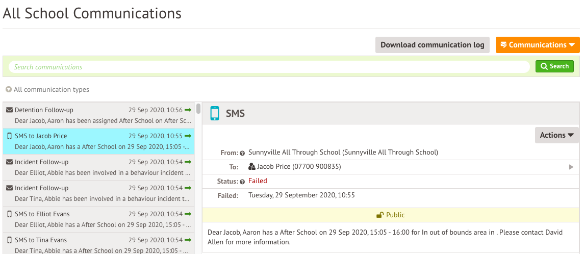 - view any communication sent to and from your school - these are displayed showing the most recent first.