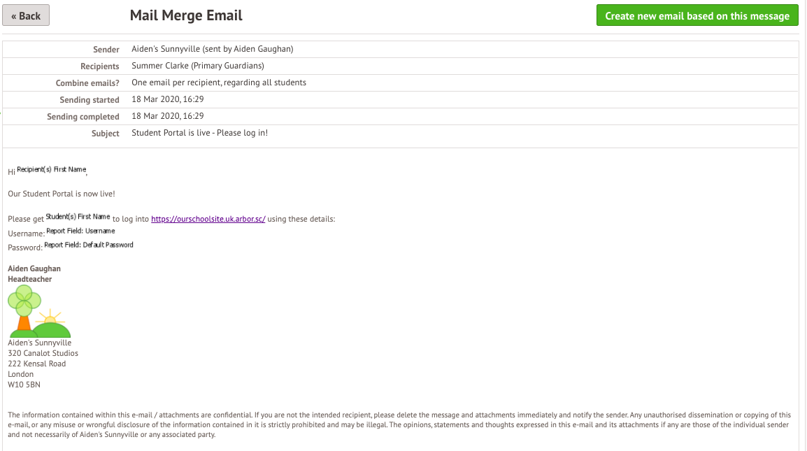 You can see the name of the staff member who has sent an email or SMS (both single and mail merge) on behalf of the school by clicking the message.