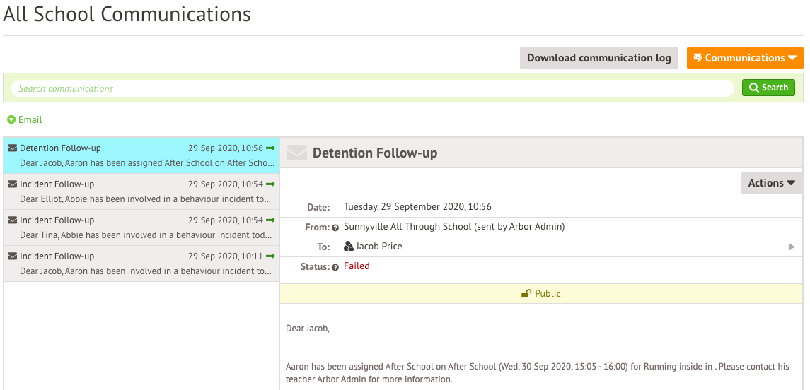 Go to School > Communications > School Mailbox. This will take you to the All School Communications Log which will allow you to: