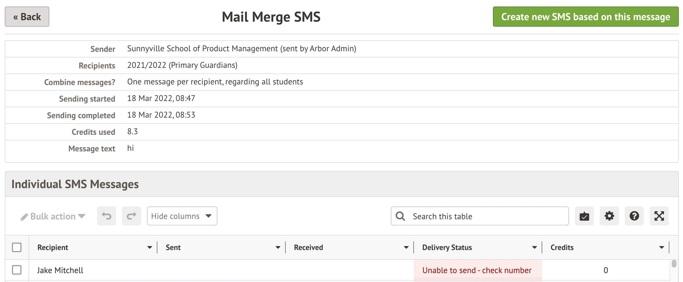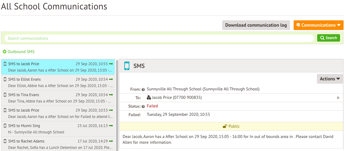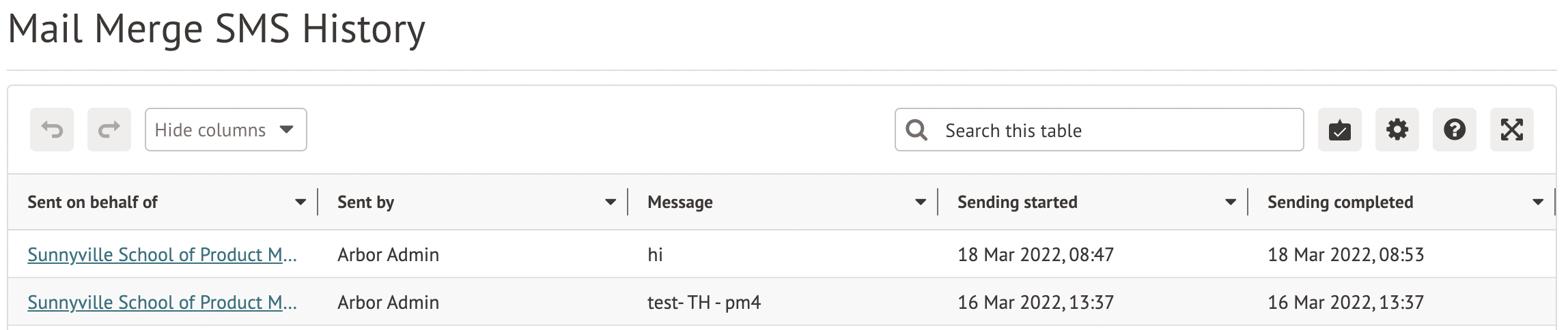 Go to School > Communications > School Mailbox > Outbound SMS to see all individual SMS messages the school has sent for the current academic year. It will not merge messages that were created from the same template at the same time.