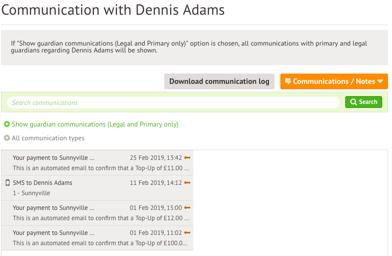 - You can view communications associated with one guardian and their linked children by finding the guardian and going to the Communication & Notes section from the left-hand side menu.