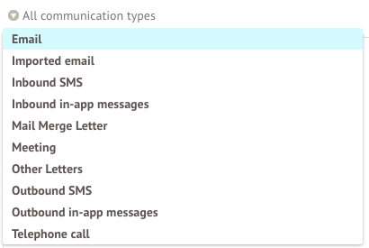 You can click on 'All communication types' to filter communications to a specific type, for example emails or letters. If you select 'Emails' you will only see emails sent out regarding the student.