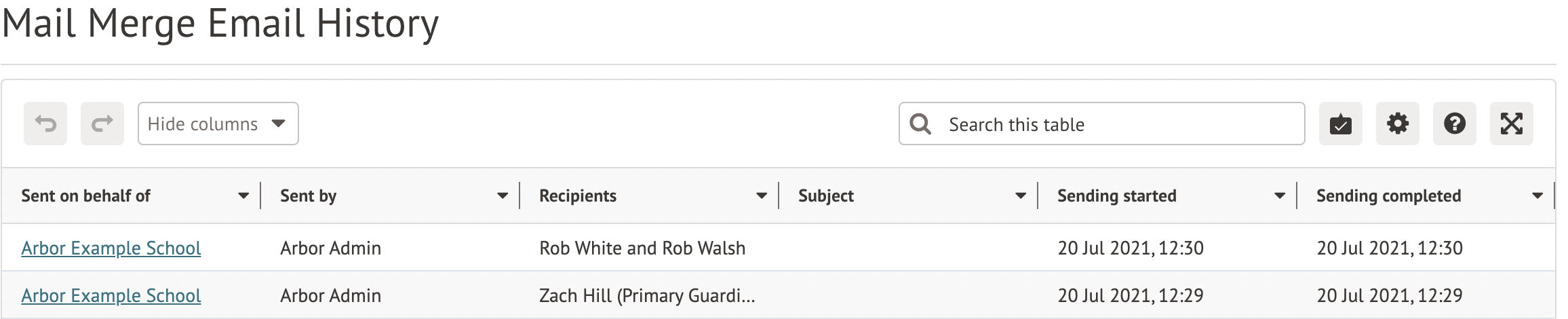 Go to School > Communications > Mailbox > Email to see all individual emails your school has sent during the current academic year. It will not merge emails that were created from the same template at the same time.