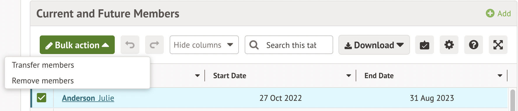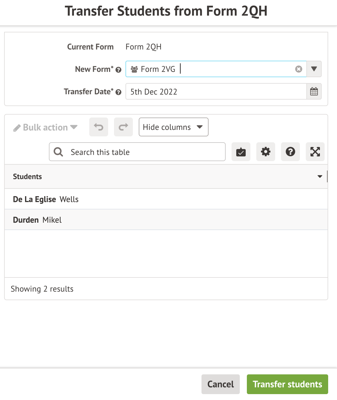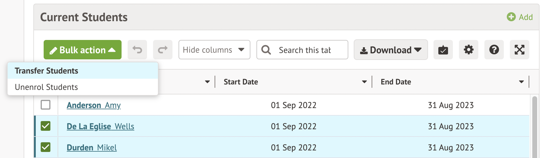 Scroll down to the Students section. Click the box next to the relevant student's name and click on the Bulk action button. Select Transfer Students.
